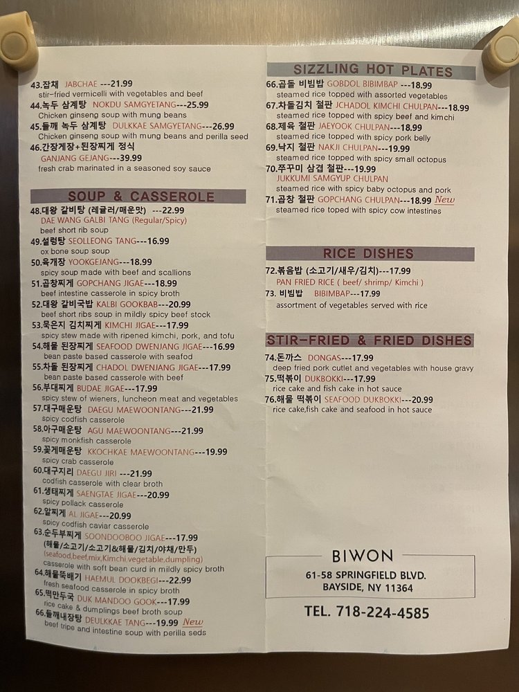 Welcome to Bi Won, a hidden gem in Oakland Gardens, NY, specializing in authentic Korean cuisine. Their extensive menu boasts delightful appetizers such as Albap rice topped with fish eggs and the must-try Haemul Pajeon, a savory seafood pancake. For noodle enthusiasts, Banban Naengmyun offers a unique blend of beef broth and spicy red pepper sauce, while the Chik Mul Naengmyun provides a refreshing cold option.